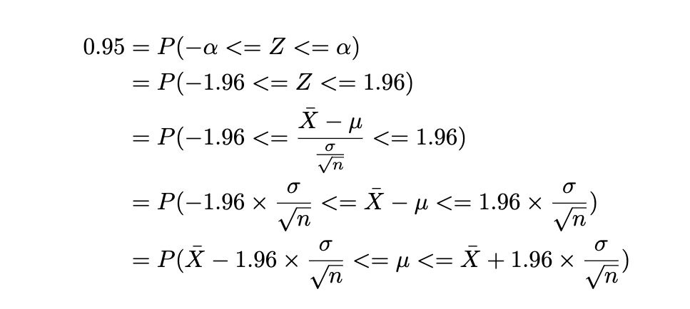 마치 정규분포에서, 학생 500명의 한 학교 학생들의 수학 시험 점수 평균을 75, 표준편차를 3으로 가정하고 95% 정도의 데이터포인트(각 학생의 점수)가 75-1.96*3, 75+1.96*3 사이에 존재한다고 했던 것과 같이, 여기서는 표본평균을 중심으로 표준오차만큼 어느 정도의 확신(95%)을 갖고 구간을 정하느냐가 됩니다. 그리고 그 값이 신뢰구간, 즉 Confidence Interval이에요.
