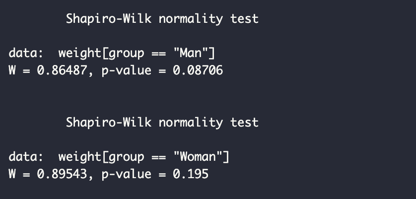 남성 그룹과 여성 그룹에 Shapiro-Wilk 검정을 한 결과, 두 그룹 모두 p-value가 유의수준(0.05)보다 높아 귀무가설을 기각할 증거가 충분하지 않다고 볼 수 있습니다. 즉, 두 그룹 모두 정규분포를 따른다고 가정할 수 있는 거죠. (만약 데이터가 정규 분포를 따르지 않는 경우라면, two-sample Wilcoxon rank test를 사용합니다.)