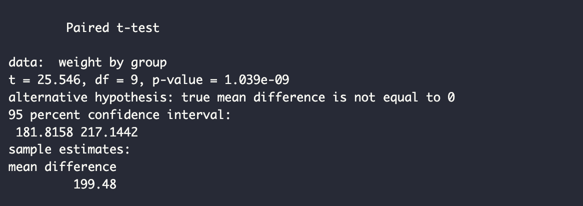 - sample estimates: 표본의 평균을 나타내며, 제일 처음 exploratory analysis차원에서 했던 박스를 보시면 그곳의 before & after 평균의 차이와 같음을 알 수 있습니다 (400.04-200.56)