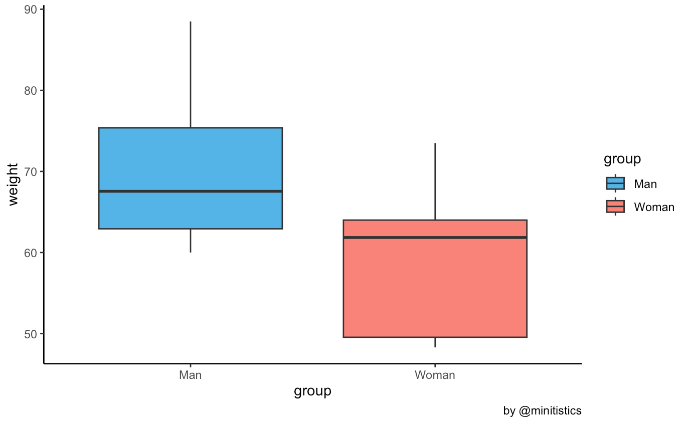 [여성의 평균 몸무게가 남성의 평균 몸무게와 같은가]를 대답하기 위해 여성 10명 남성 10명을 표본으로 뽑아 t-test를 실행합니다.