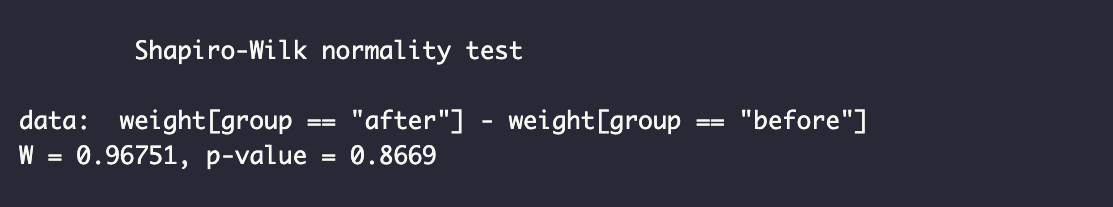 지금까지 잘 따라오셨다면, 이 결과의 의미를 아실거에요. 바로 before와 after의 차이가 정규분포를 따른다고 가정할 수 있다! 이죠. 이제 paired t-test를 해보겠습니다.