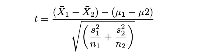 서로 다른 두 독립 표본의 평균 차이에 대한 가설검정으로 두 데이터 그룹의 평균을 비교합니다. (서로 다른 두 학급의 평균 시험 점수를 비교). two-sample t-test의 t-score는 다음과 같이 구합니다.