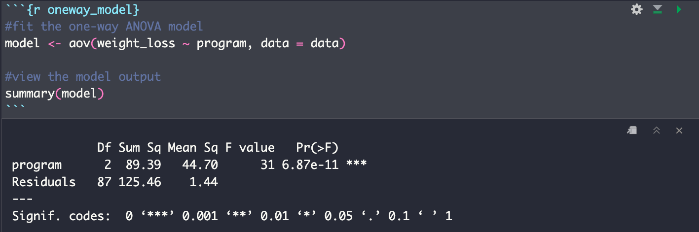 P-value가 유의 수준 5%보다 작은데 옆에 별표 "***"의 수를 통해 얼만큼 유의한지의 strength를 나타냅니다. 위의 결과로 보면, 우리는 귀무가설을 기각할 증거가 충분히 있다고 해석할 수 있죠. 즉, 세 그룹 중 어느 한 쌍의 그룹 간 몸무게 차이가 매우 유의하다, 라는 결론을 내릴 수 있습니다.