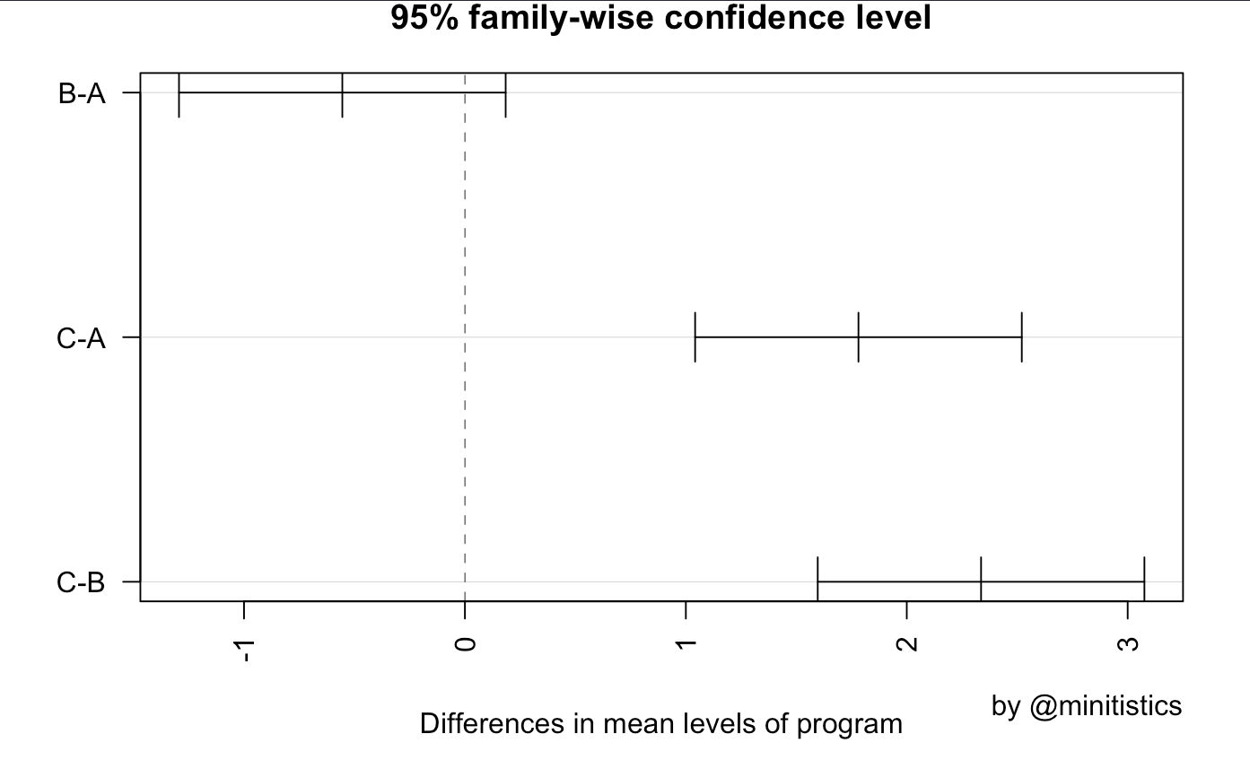 ANOVA는 독립 변수 중 적어도 한 쌍에서 유의한 차이가 발견되는지는 알려 주지만 어느 그룹간의 차이가 중요한지는 알려주지 않습니다. 이때 수행하는 테스트로 Tukey HSD(Tukey Honest Significant Differences)를 사용할 수 있는데요, 결과는 아래와 같습니다.