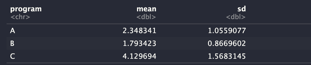 - Sum Sq: 그룹 평균과 해당 변수에 의해 설명되는 전체 평균 사이의 제곱합(총 변동)을 표시합니다. 프로그램 변수(A, B, C)의 제곱합은 89.39인 반면 잔차의 제곱합은 125.46입니다.