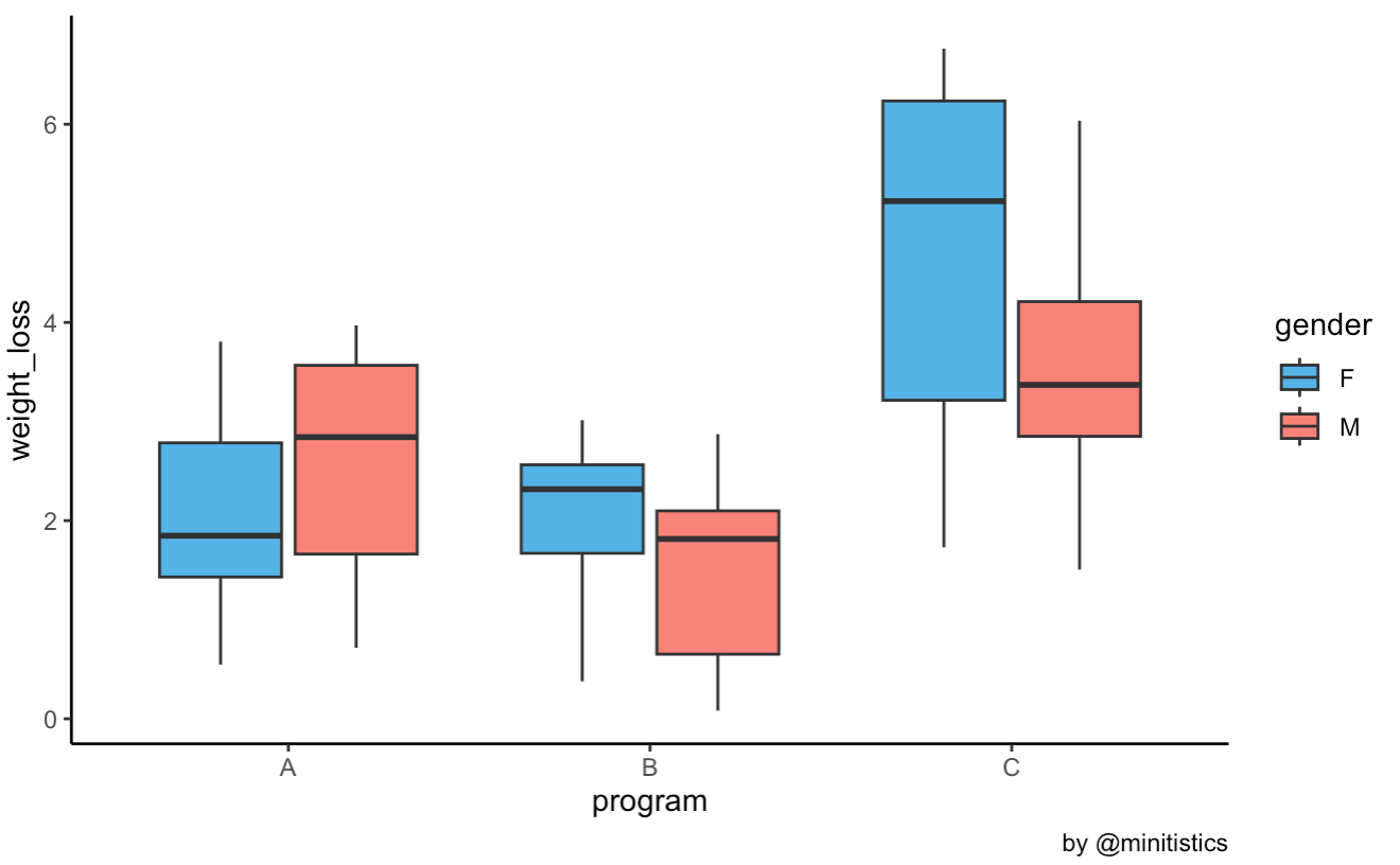 이원 분산분석은, 독립 변수가 둘인 경우로 일원 분산분석에서 사용하였던 예시인, 체중감량 프로그램 + 성별이 체중감량에 얼마나 영향을 미치는지, 그리고 그 결과가 통계적으로 유의한지 알아보겠습니다.