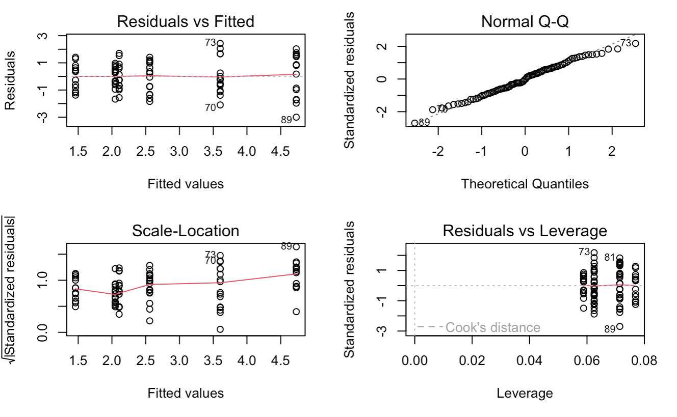 이에 대한 각 뜻과 차트를 보는 방법을 일원 분산분석에서 다루었으니 여기서는 결과 plots만 확인 차 보여드리고 넘어가겠습니다. 결론은 세 가지 가정을 모두 만족하므로, 이원 분산분석(상호작용) 모델로 각 구성의 영향을 파악하는 사후 검정을 해보도록 하겠습니다.