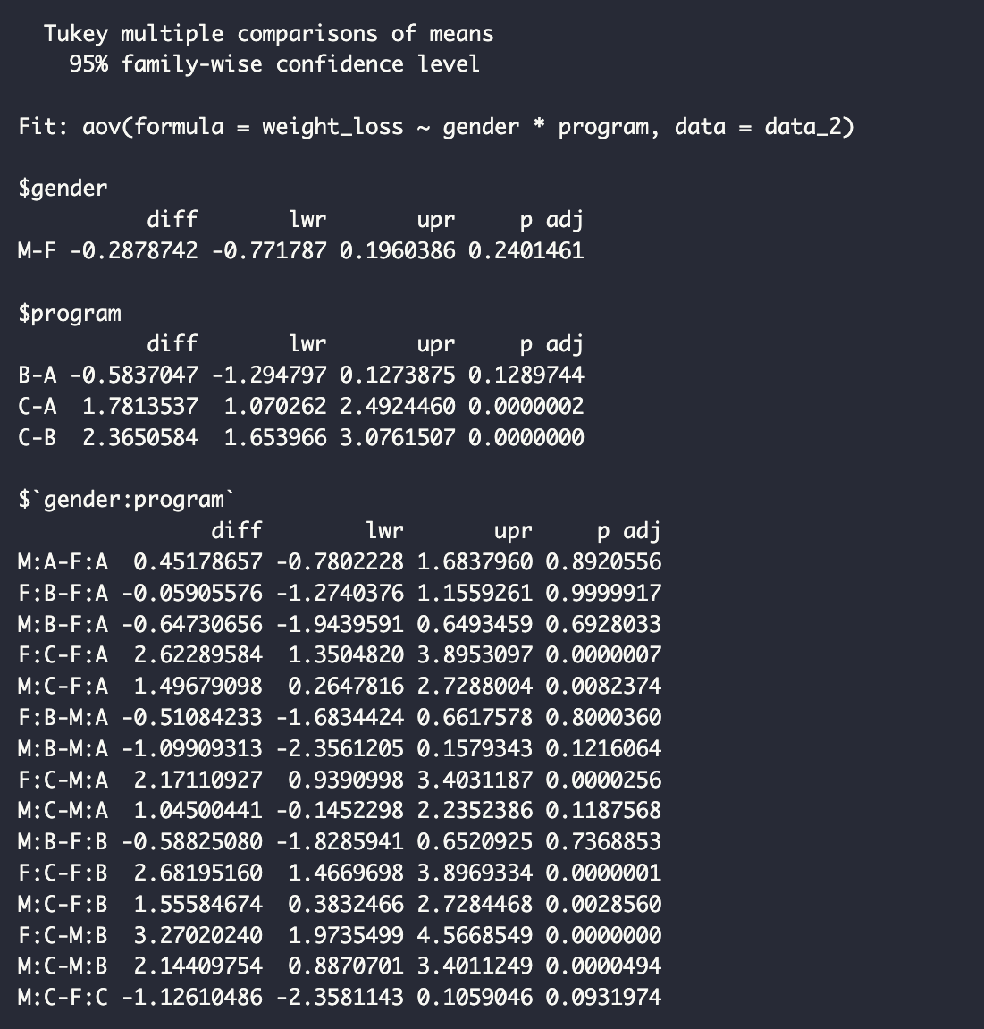 가장 유의한 결과를 찾아보자면, F:C-M:B로, 여성이 C프로그램을 사용하였을 때, 남성 B 프로그램에 비해 매우 높은 체중 감량 효과(평균적 차이 3.27kg, p-value <.0001)를 가져온다가 될 수 있습니다. 여성에게 체중감량을 위한 프로그램으로는 C가 제격이겠구나, 하는 결과를 얻은 셈이 되는거죠.
