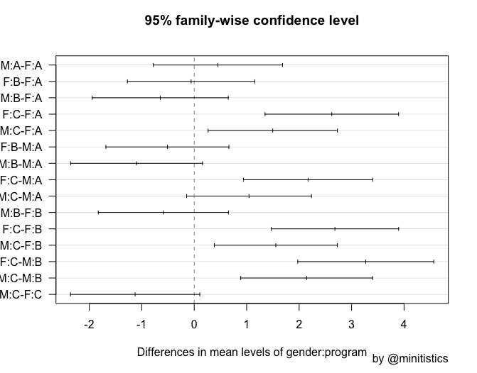 아래는 R 사후검정 결과 중 95% 신뢰 구간을 시각화 하였는데요, 위의 해석과 같이 F:C-M:B가 가장 유의한 차이를 나타낸다는 것을 확인할 수 있습니다.