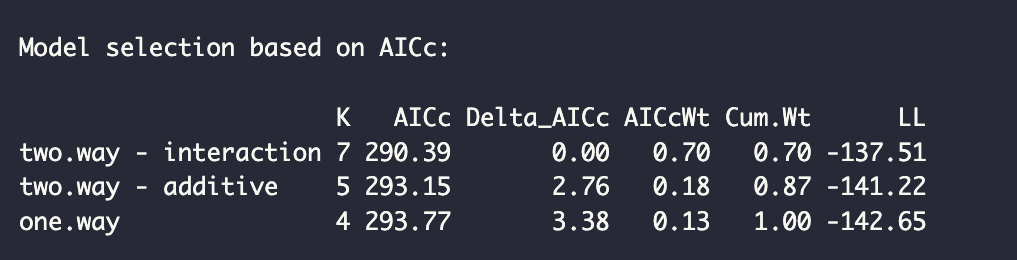 이원 분산분석(Interaction)의 모델의 AIC 값이 290.39로 가장 낮고, AIC 가중치(AIC weight)가 70%로 가장 높습니다. AIC 가중치 비율은 이 모델이 종속 변수의 전체 변동 중 70%정도를 설명한다는 뜻입니다.