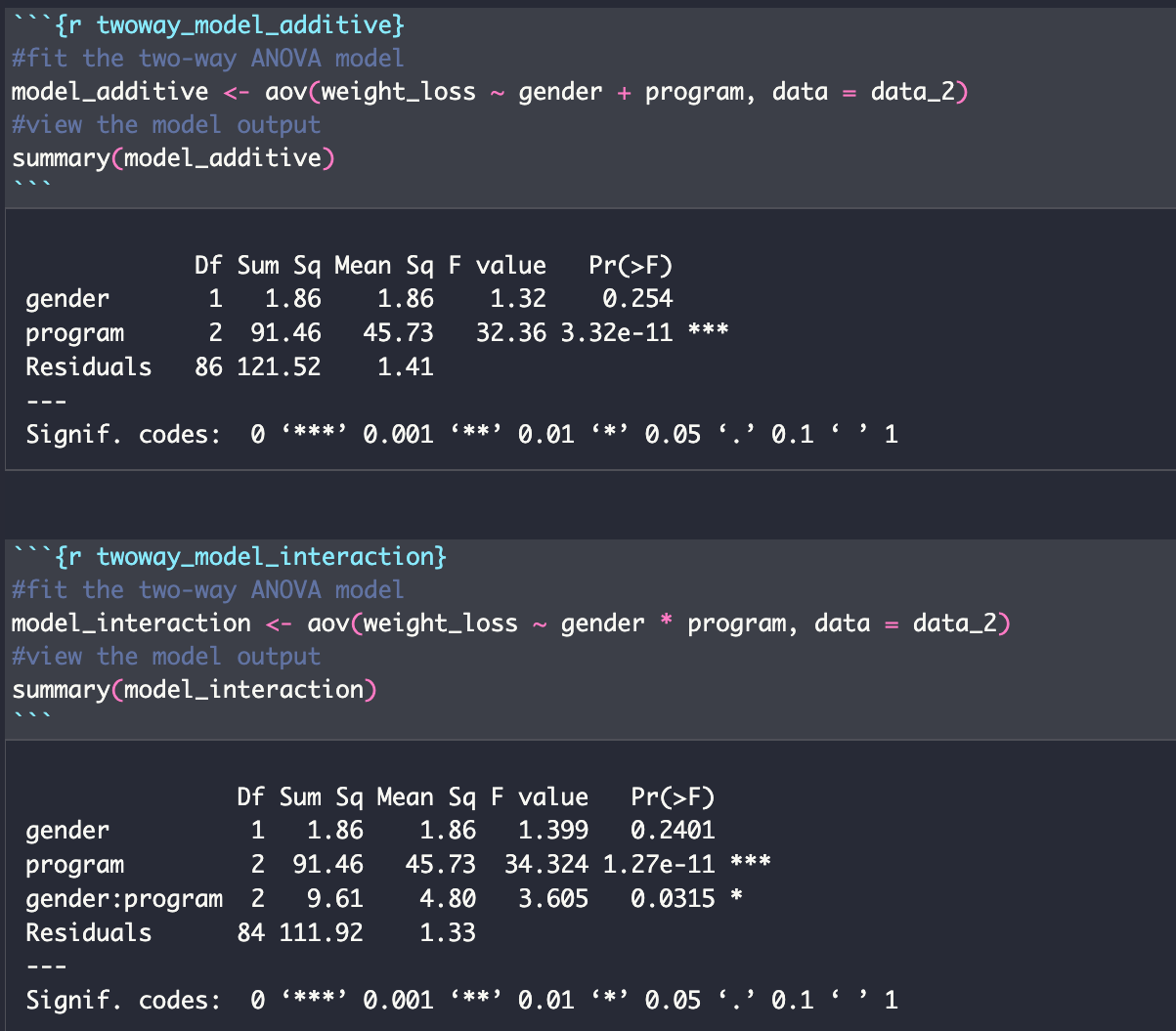 그렇다면 최종 선택 모델은 이원 분산분석(상호작용)이 될텐데, 이 모델에서 우리는 성별과 체중 감량 프로그램이 체중 감량에 미치는 영향 사이에는 통계적으로 유의미한 상호작용이 있다는 것을 확인할 수 있습니다(F(2, 84) = 3.605, p = 0.0315).