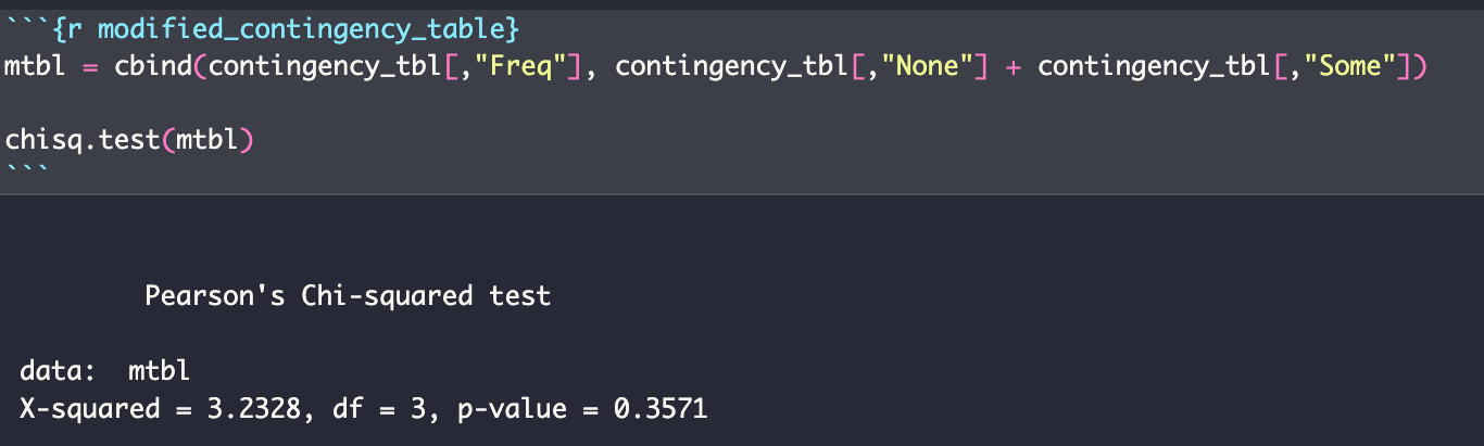 위의 R출력값에서 눈치 채신 분도 있으셨겠지만, Warning 사인이 있어요. 적합도 검정에서도 다루었지만, 각 그룹의 기댓값이 최소 5 이상이어야 한다는 거 기억하시나요? 우리가 3번에서 계산한 그룹의 값 중 운동량(None)값이 현저히 낮음을 알 수 있습니다. 데이터 그룹의 기댓값을 높이기 위해 운동량 None과 Some을 한 그룹으로 가정하고 다시 한번 카이제곱 독립 검정을 R로 실행해 보겠습니다.