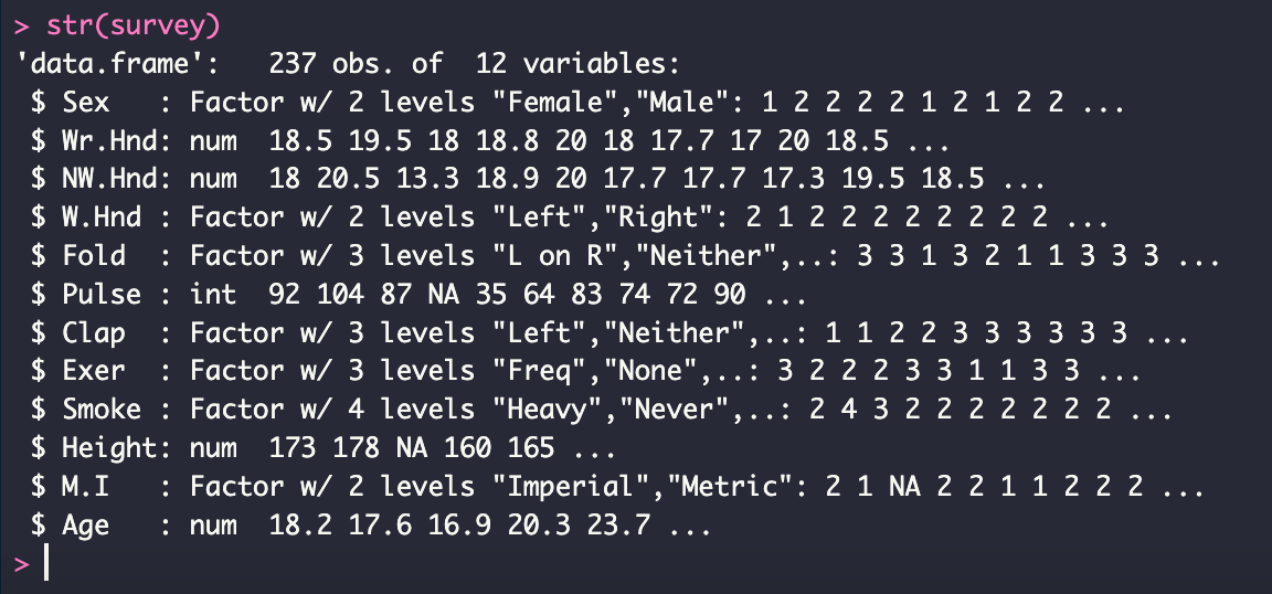 이번 검정을 위해서는 R의 library(Mass)에 있는 데이터 survey를 사용하도록 할게요. survey의 데이터 구성은 다음과 같습니다. 237의 관찰값이 있고, 12개의 변수가 있음을 알 수 있습니다. 이 중, 우리는 흡연(Smoke)과 운동(Exer)의 관계에 대해서 알아보고자 합니다. 즉,