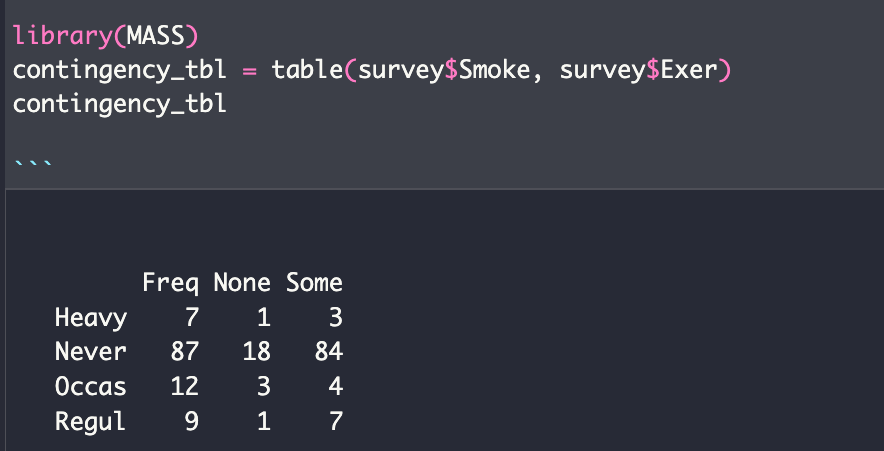 변수 조합의 분포를 나타내는 표를 Contingency table 이라고 하는데, 도수 분포표의 개념과 같습니다. 흡연과 운동, 두 변수만 extract 하여 테이블로 나타내어 보면: