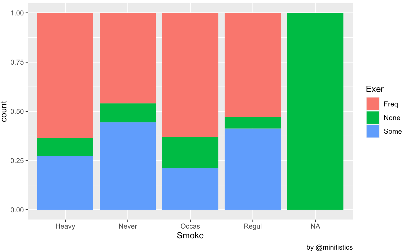 데이터에서 흡연(smoke)의 값으로는 [Heavy(매우 자주)], [Regul(정기적)], [Occas(종종)] 그리고 [Never(전혀안함)]입니다. 운동(Exer)은 [Freq(자주)], [Some(조금)] 및 [None(전혀안함)]으로 볼 수 있겠습니다. 이 두 변수의 관계를 시각적으로 나타내어보면 다음과 같습니다. 흡연을 매우 자주(Heavy) 하는 사람들 중 운동 또한 자주(Freq) 하는 사람의 비율이 높은 편인데요, 이와 같이 흡연과 운동의 관계가 그룹의 다른 값에서도 비슷한 패턴을 보이는지(서로 연관이 있는지)를 알아보는 것이, 카이제곱 독립검정의 핵심입니다.