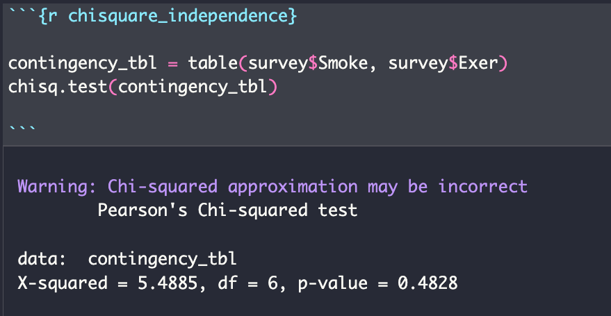 보시다시피, Warning 사인은 없어졌지만, 여전히 p-value는 유의 수준보다 높습니다. 결국, 흡연을 많이 하는 사람이든 적게 하는 사람이든, 그들이 운동을 많이 하거나 적게 하는 데에는 아무 관련이 없다는 결론을 내릴 수 있습니다.