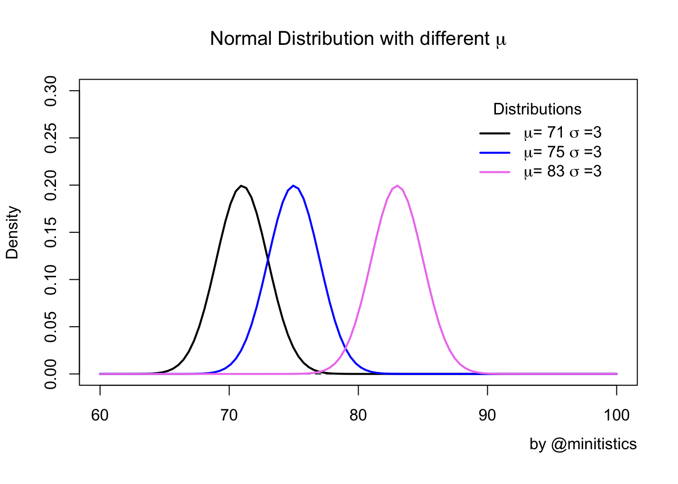 평균값이 높을수록 분포의 중앙값이 우측으로, 낮을수록 좌측으로 이동하며, 표준편차가 높을 수록 퍼짐이 큰 것을 볼 수 있습니다.