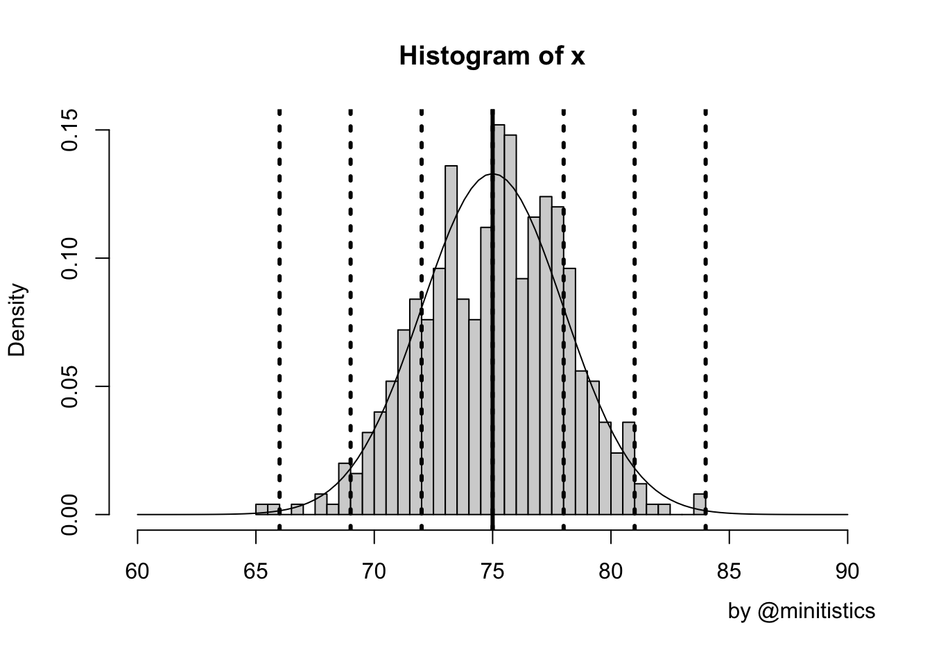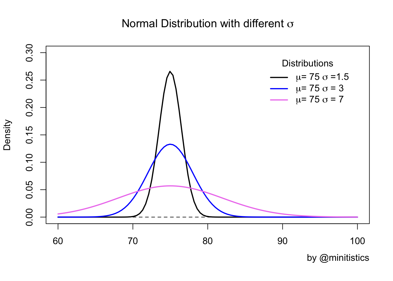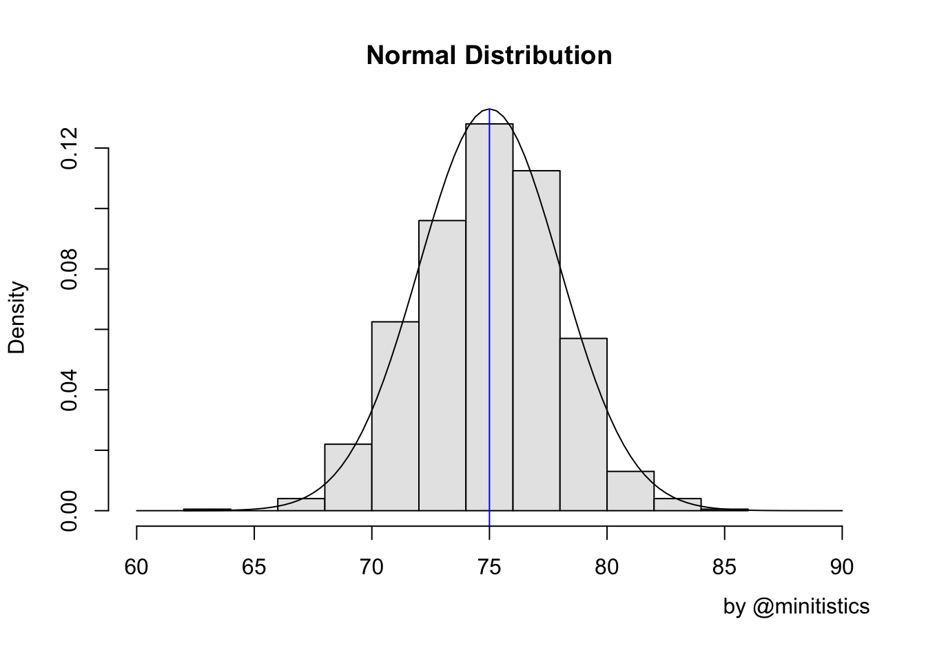 예를 들어, 학생 500명의 한 학교 학생들의 수학 시험 점수 평균이 75, 표준편차를 3이라고 가정하였을 때 다음과 같은 그래프로 나타낼 수 있습니다.