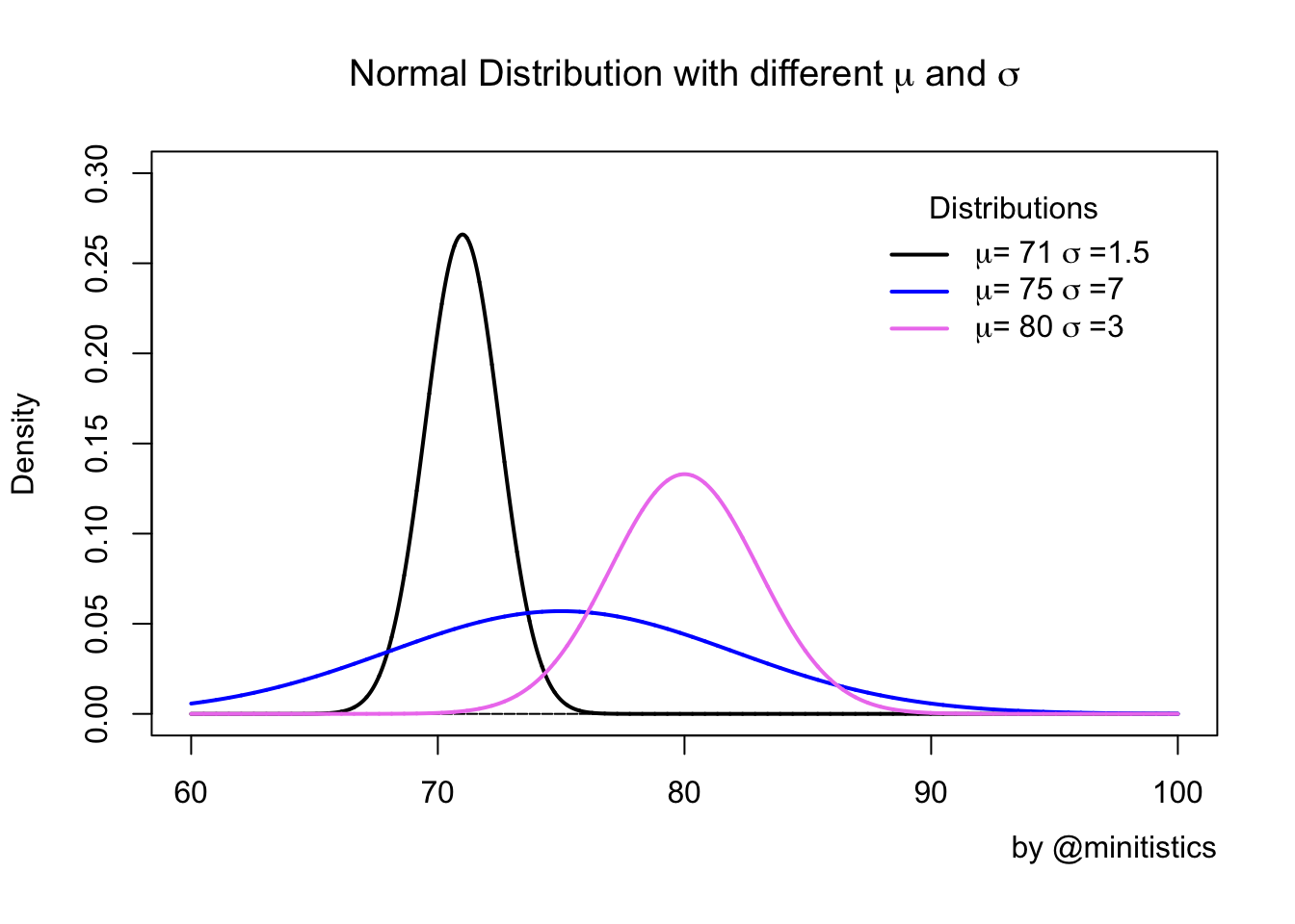 앞에서 잠시 언급했지만, 그래프의 모양은 평균($\mu$)과 표준 편차($\sigma$)로 결정됩니다. 평균값은 정규 분포의 중심 위치를 결정하고, 표준편차는 정규분포의 좌우 퍼짐 정도를 결정합니다.