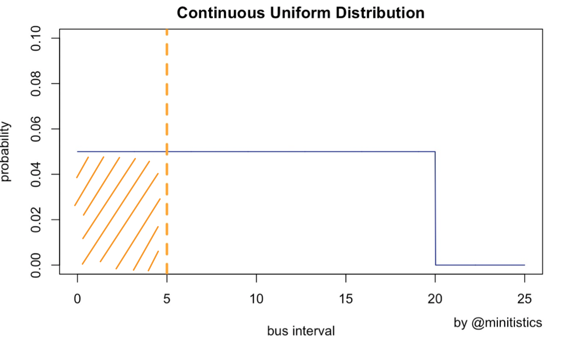 그래프로 그려보면 아래와 같습니다. 5분 이내에 올 확률을 구하는 것이므로 5*(1/20) = 0.25 즉, 25% 확률로 버스가 5분 내에 도착한다고 할 수 있습니다.
