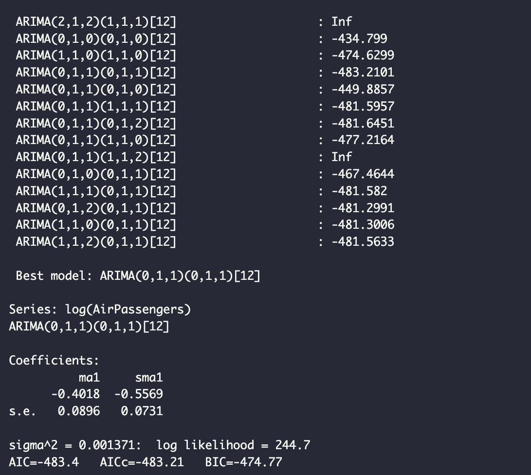arima1 <- auto.arima(log(AirPassengers),trace=TRUE)