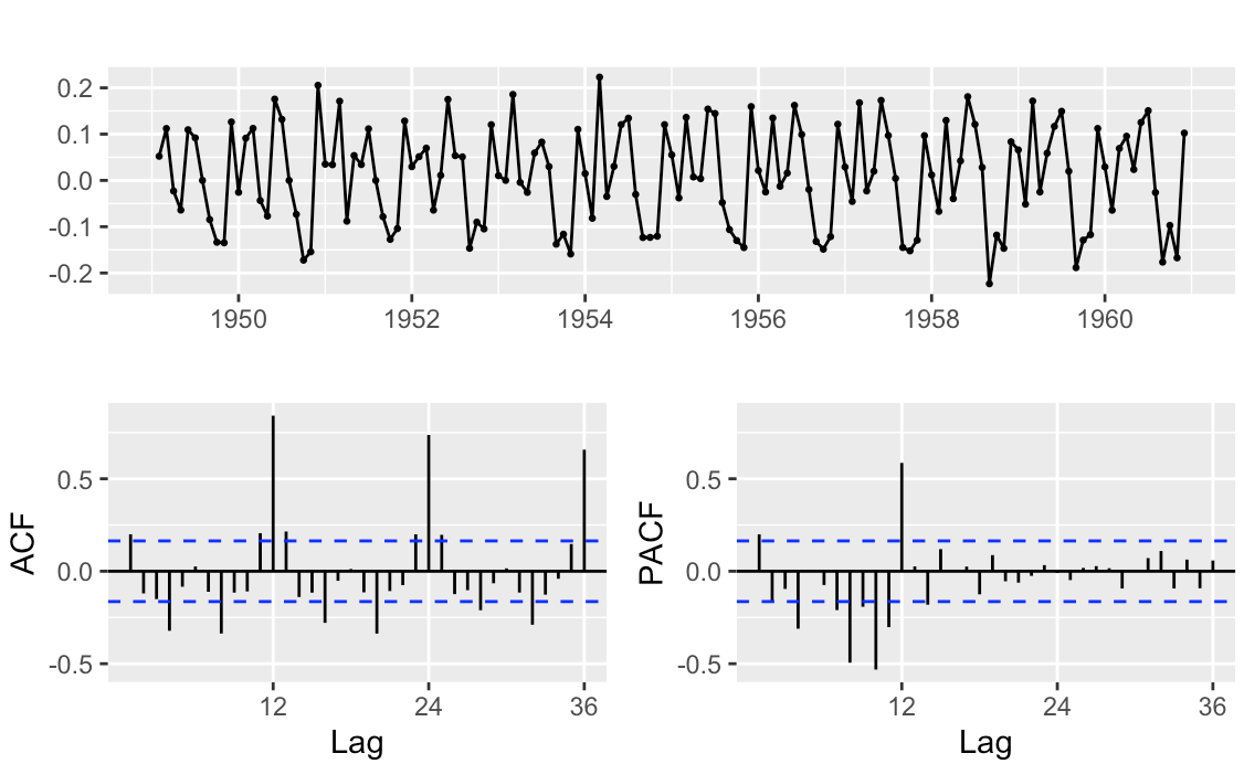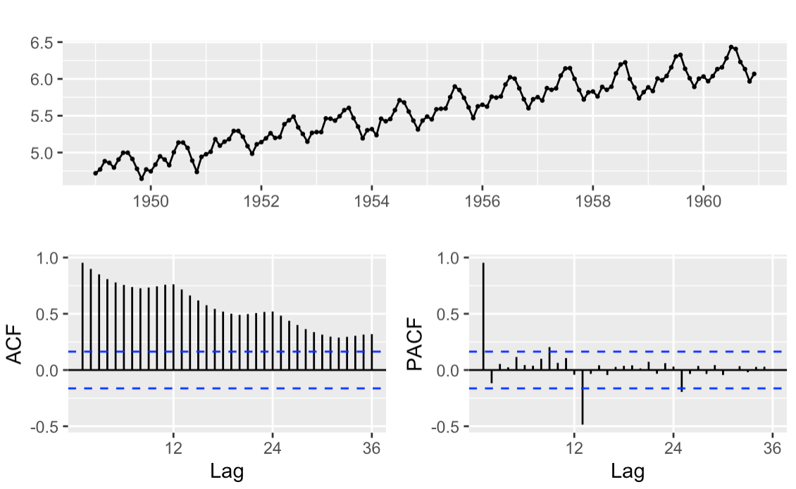 2. log(Passengers): Passengers 에 로그를 취한 값으로, 분산의 스케일만 조정할 뿐, 패턴은 조정되지 않아 ACF & PACF에도 1과 비교했을 때 변화가 없음을 알 수 있습니다.
