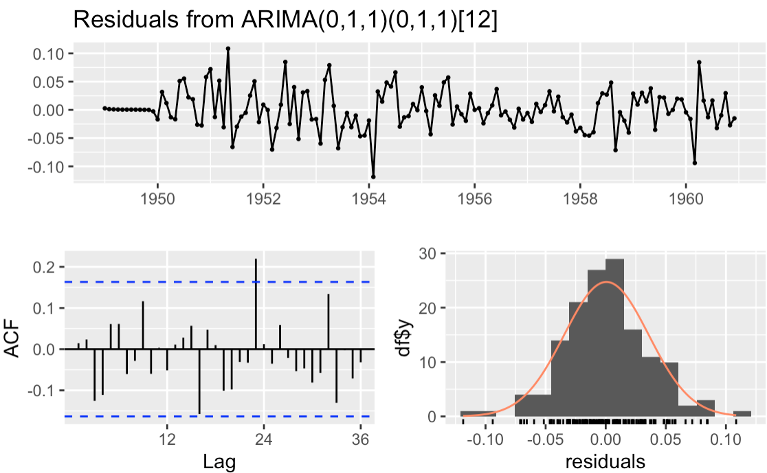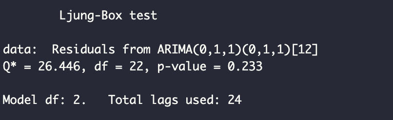 ACF가 완전한 정상성을 나타내지는 않지만, 모델의 적합성과 얼마나 over-fiitting할 것인지에 대한 trade-off가 있다는 것을 감안하여, ARIMA(0,1,1)(0,1,1)[12]를 사용하기로 결정합니다.