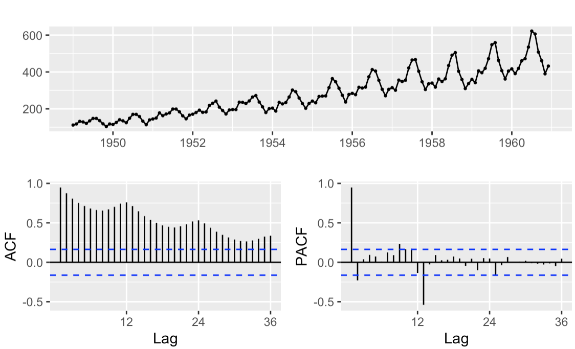 1. Origianl Data: Passengers 값을 그대로 사용하면 ACF에서 움푹움푹 패인 부분이 여실히 나타납니다. 계절성이 강하기 때문인데요, 이 데이터 자체로는 non-stationary 입니다.