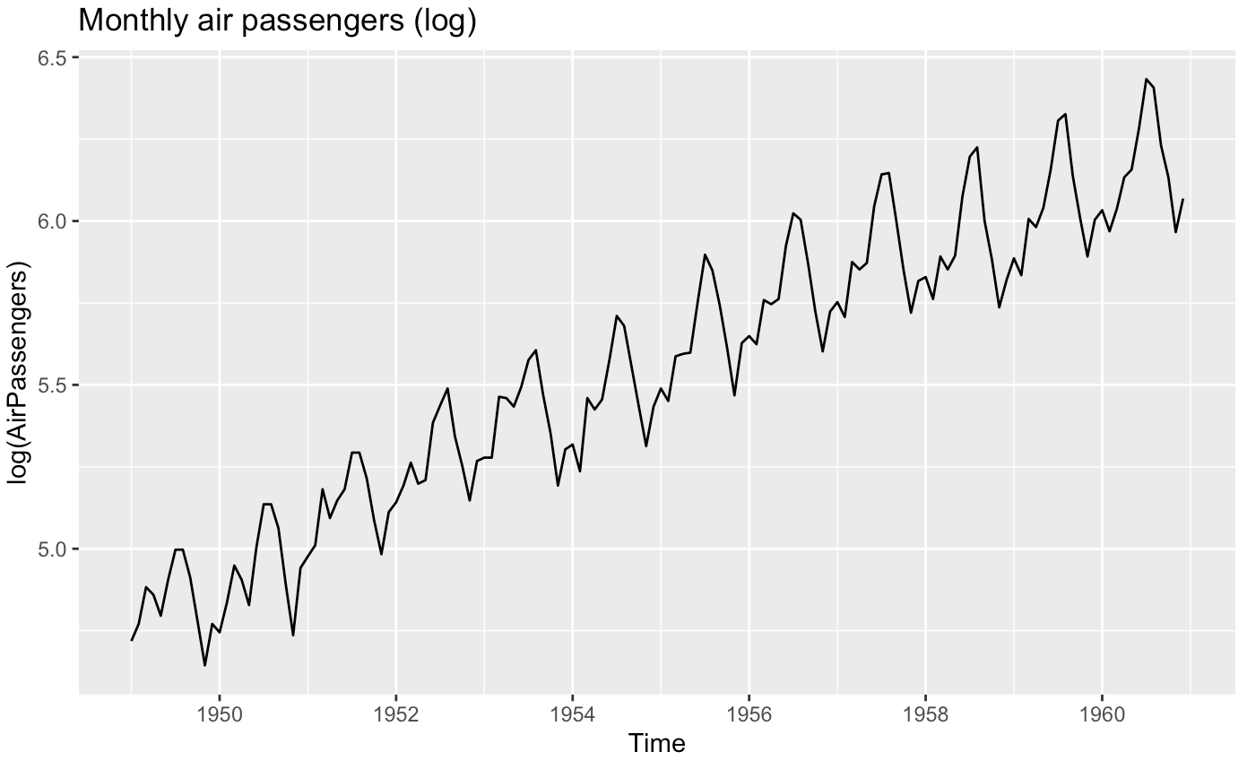 autoplot(log(AirPassengers), main = "Monthly air passengers (log)")