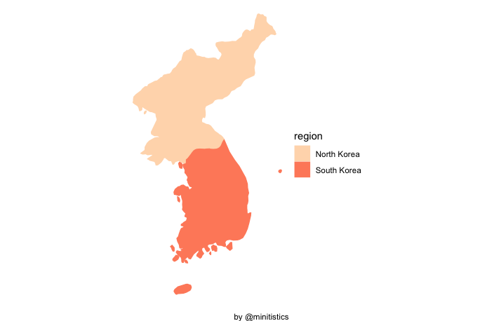 ggplot(korea, aes(long, lat, group = group, color = region, fill = region)) +
