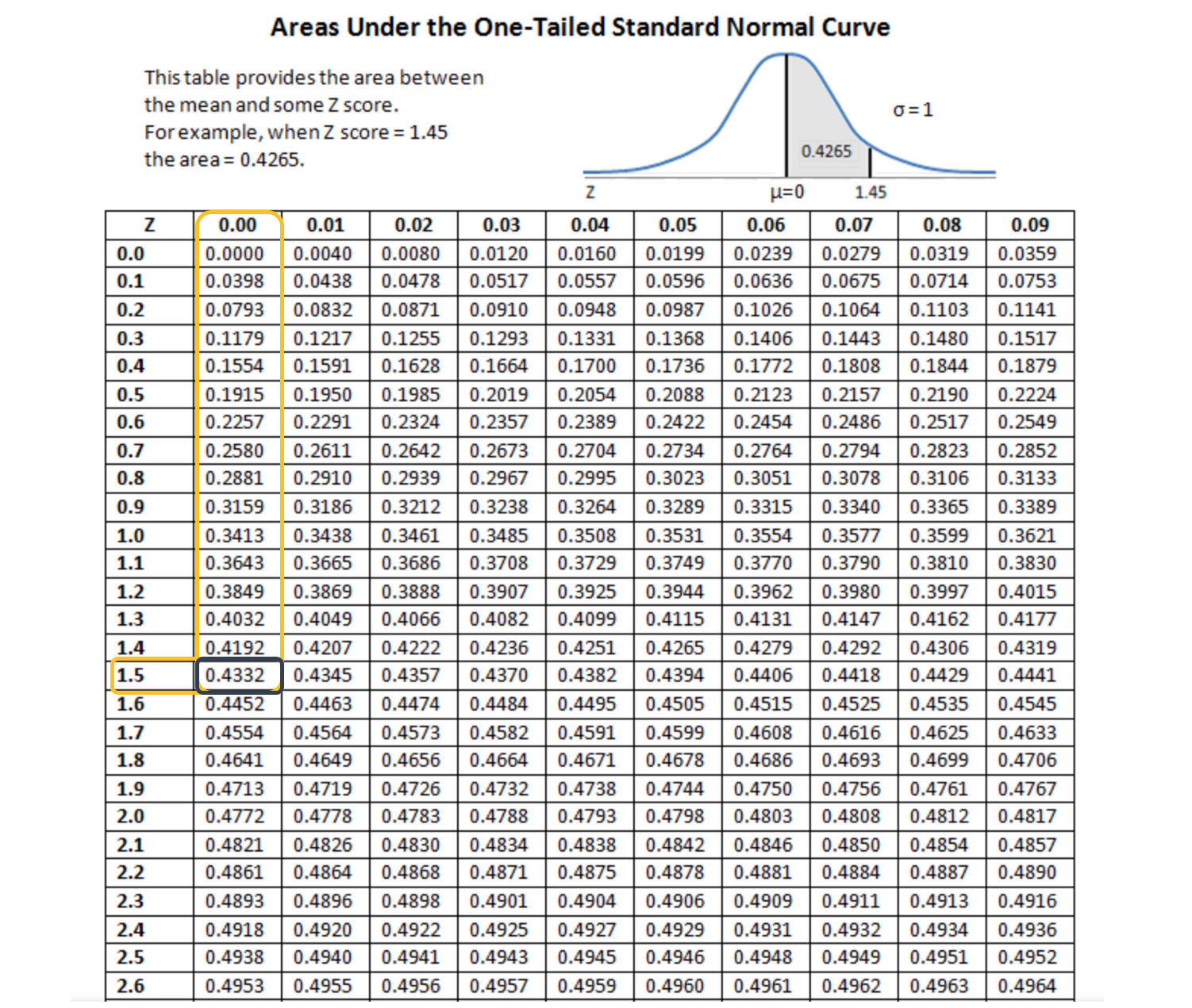 표준정규분포의 면적은 표준정규분포표를 이용하여 구하는데요, 이와 같은 경우는 1.5가 좌우 대칭으로 있는 것과 다름없으므로 아래의 One-Tailed 표를 사용하여 1.50의 값*2를 하면 확률을 구할 수 있습니다.