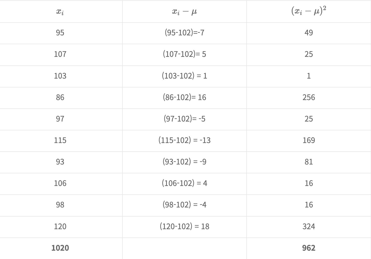 그러므로 분산은 $\sigma^2 = 962/10 = 96.2$, 표준 편차 $\sigma = \sqrt{96.2} = 9.81$ 입니다.