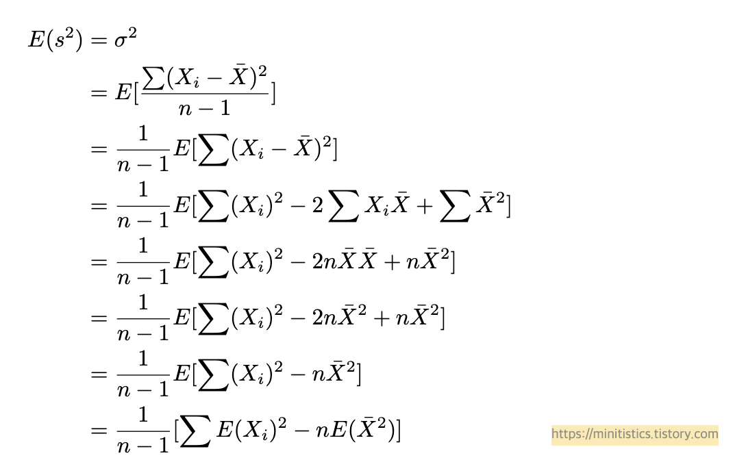 지난 포스팅 분산과 표준편차에서 분산과 표준 편차 구하는 공식과 함께 어떻게 표본 집단의 분산에 n-1을 취했을 때 모분산과 같아지는지 예시를 통해서 설명하였습니다. 이번 포스팅에서는 수식을 통해서 이해해 보는 시간을 갖도록 해볼 거예요.